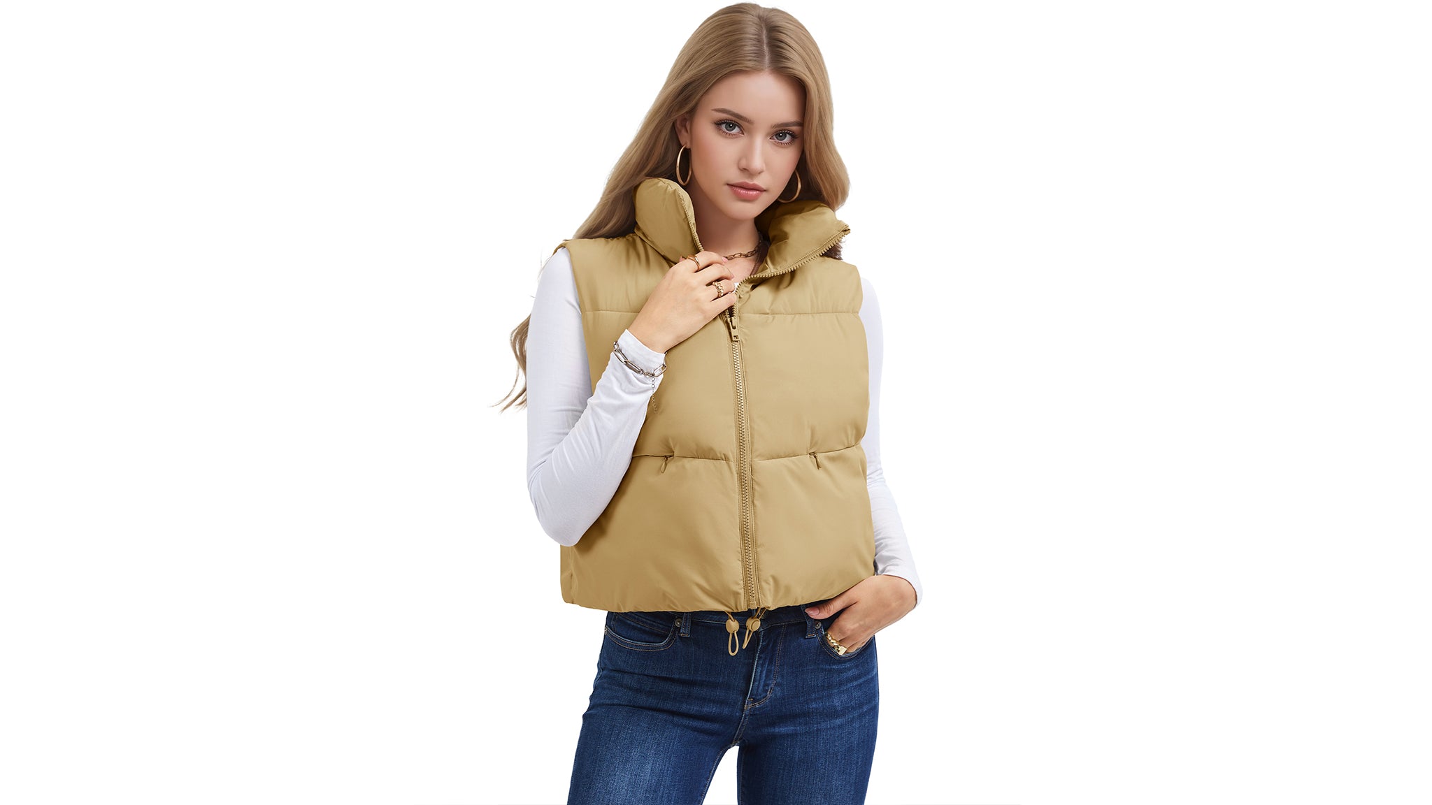 Features: Stand collar, sleeveless cut, full zip, adjustable drawstring hem, and 2 hidden zip pockets.