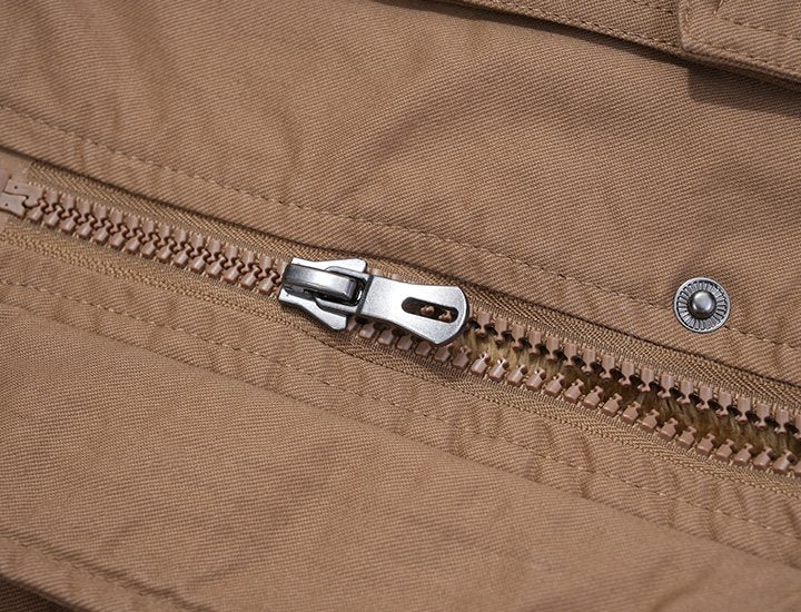 The shell is made of cotton and the inner is made of polyester.The quality fabric makes this fleece jacket warm, comfortable and not easily damaged.