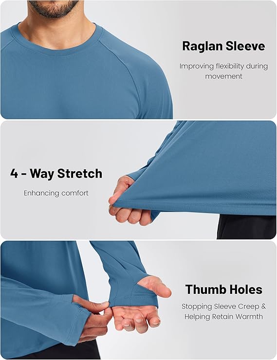 Design: Thumb holes prevent sleeve riding; raglan sleeves allow full movement; tag-free collar and flatlock seams reduce chafing.